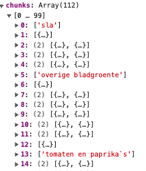 当遇到对象时,它会被推入chunk变量的当前数组中。如果(将当前对象推入块后)块的长度等于所需的计数,则将块数组本身推入结果数组,并创建一个新的数组并分配给chunk变量。循环结束后,如果chunk数组中有任何剩余的对象,那么这个块也会被推入结果数组。