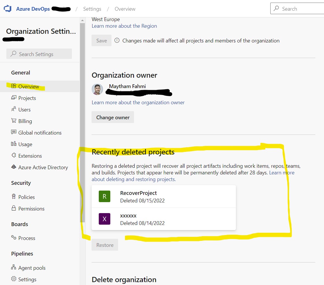 如果一个项目和组织被错误删除,如何在Azure DevOps中恢复已删除的项目和组织?