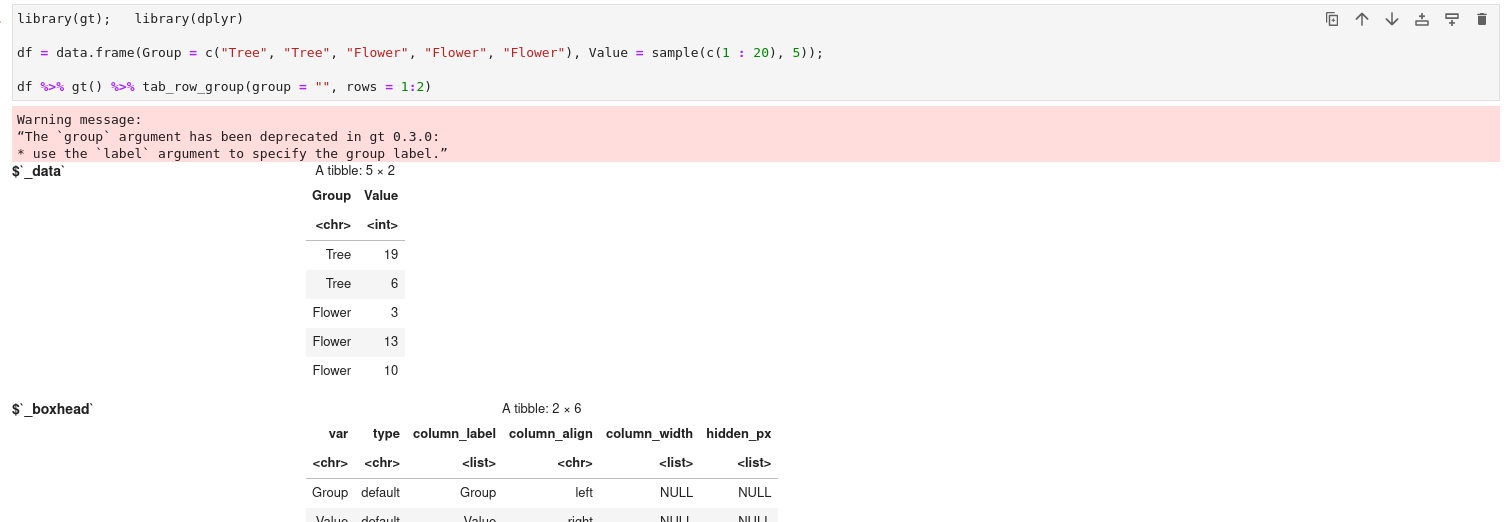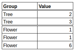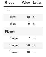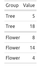 df = tibble(Group = c("Tree", "Tree", "Flower", "Flower", "Flower"), Value = sample(c(1 : 20), 5), Letter = letters[1 : 5]);