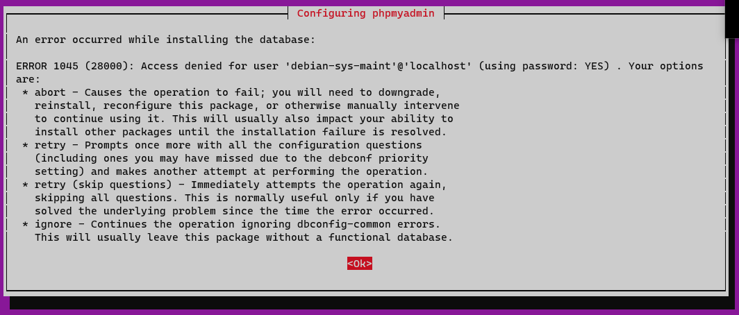 当我卸载和重新安装phpMyAdmin时,发生了一种奇怪的行为。我知道这个错误。我想是因为同样的问题导致我无法通过终端登录到MySQL。