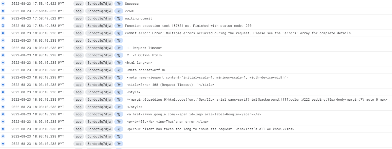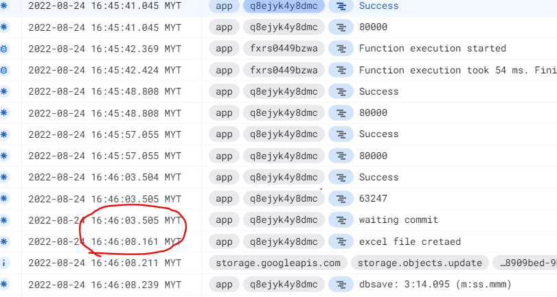 我使用NodeJS导出大型excel数据,在本地机器上大约400 K行只需2分钟以上。但是,在我部署到Google云功能之后,它就会一直停留在提交文件上,直到函数超时为止。我不知道为什么在我的本地机器是快速的,但谷歌功能将超时。