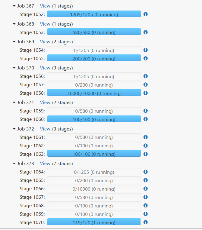 我正在使用Databricks为大数据创建一个算法。我想知道为什么我的最后1%的运行过程需要很多时间?我用S3编写结果,111991个数据的结果(在116367个数据中)是在5分钟内完成的,而最后的5000个数据只需要一个多小时!