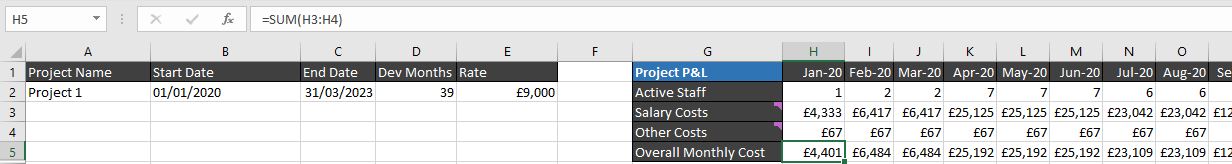 我有一个可变长度的项目,用D2表示为39个月。在单元格H1中,我有以下- =EDATE($B$2,SEQUENCE(1,$D$2,0)),它自动计算项目持续期间的月份。我想要创建一个函数,它将自动添加H3和H4中的值,然后是I3和I4等。所以在H5中,我有= sum (H3:H4),是否可以将一个函数粘贴到H5中,在项目持续期间将每个列相加?