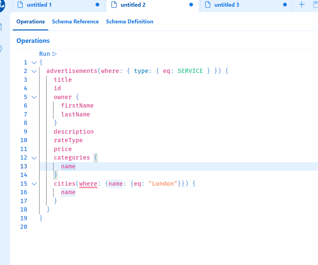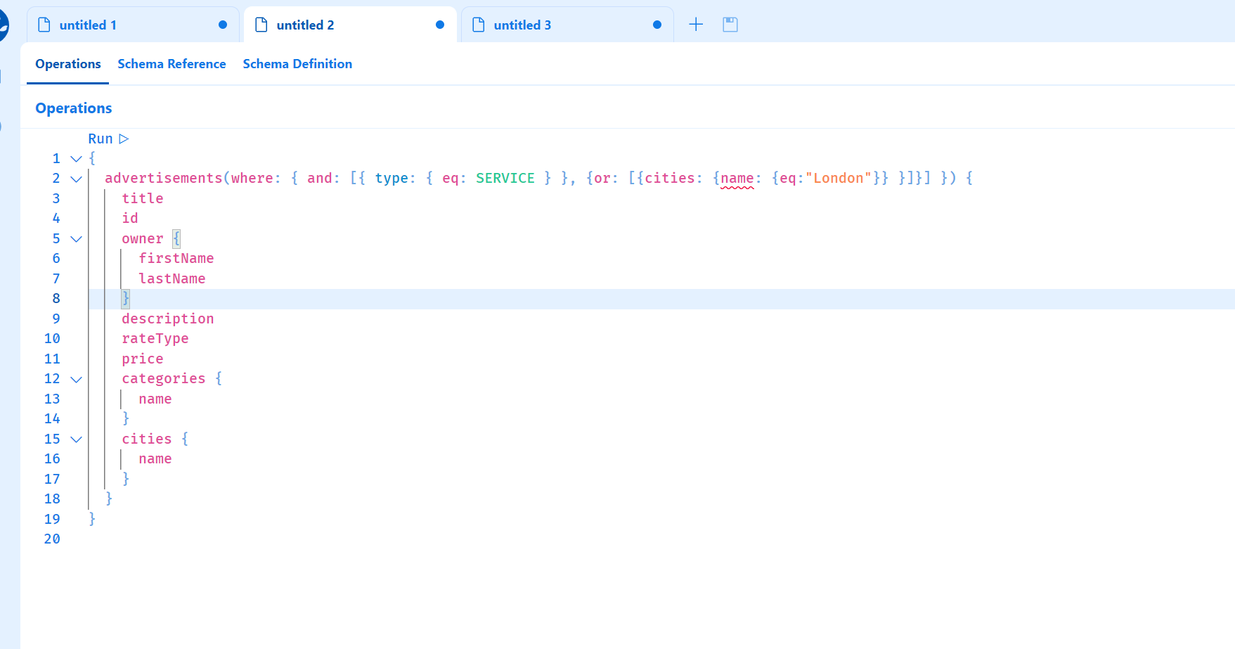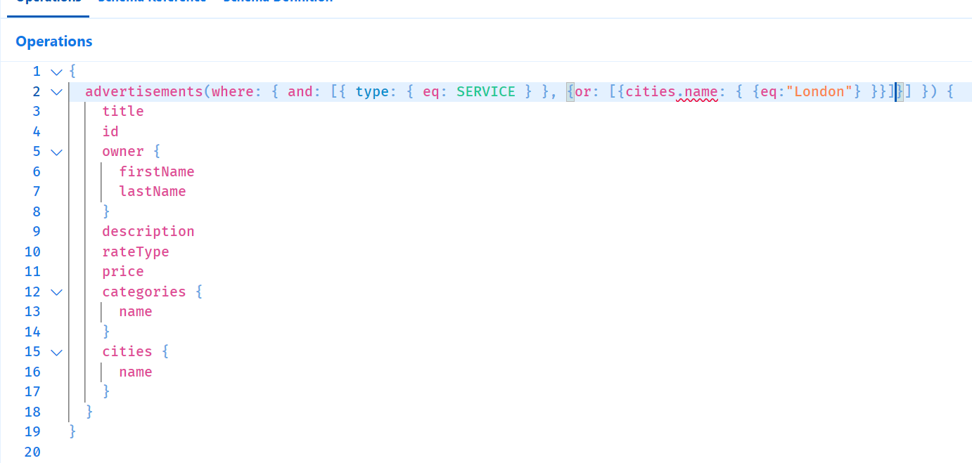advertisements(where: { and: [{ type: { eq: SERVICE } }, {or: [{cities.name: { {eq:"London"} }}]}] }) {