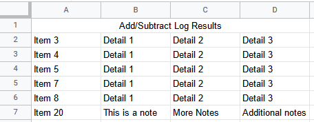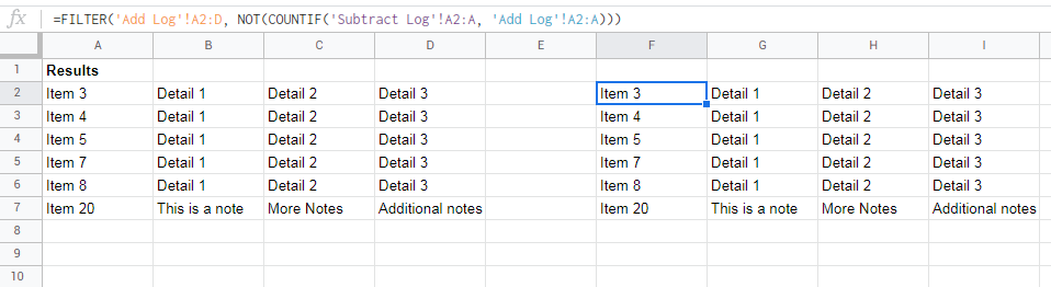 我试图跟踪Add Log和Subtract Log中的项目列表,并根据使用Subtract Log删除的项目创建仍然库存的项目列表。我希望Add/Subtract Log Results显示在Subtract Log中没有匹配的唯一ID (ColA)的所有项,除非返回了一个条目并向Add Log添加了第二、第三、第四等时间。如果该项再次添加到Subtract Log中,则应从添加/减法日志结果表中删除该项