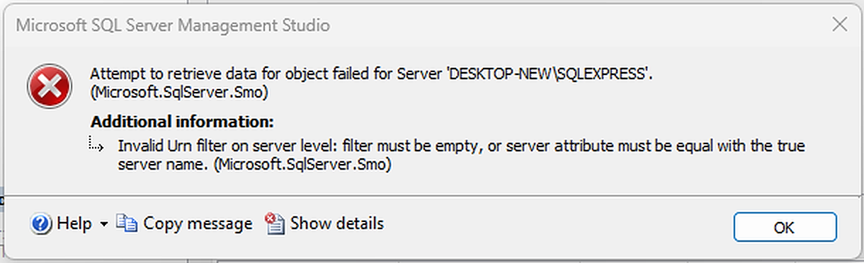 尝试为服务器桌面检索对象的数据失败-新\SQLEXPRESS‘。(Microsoft.SqlServer.Smo)