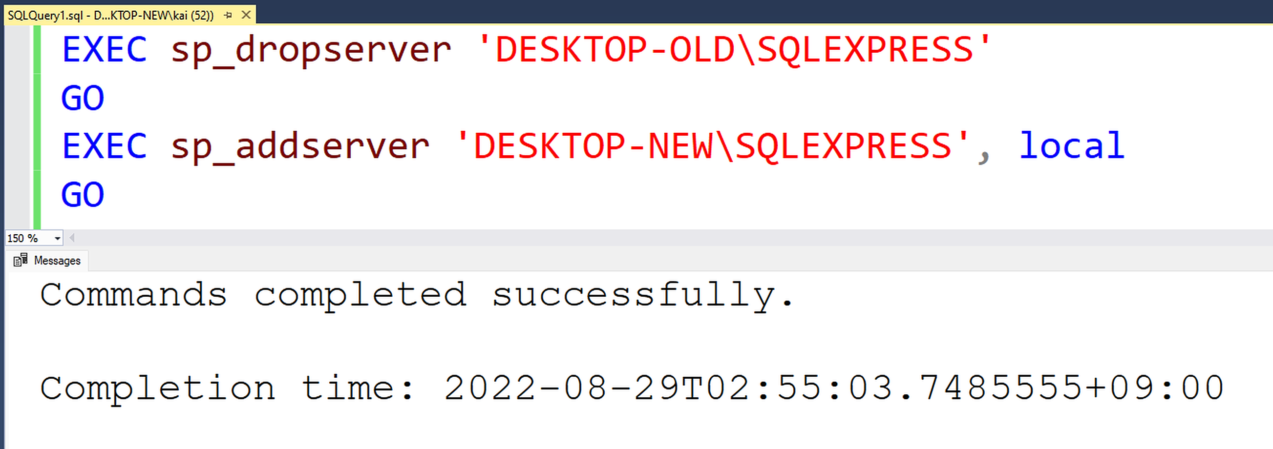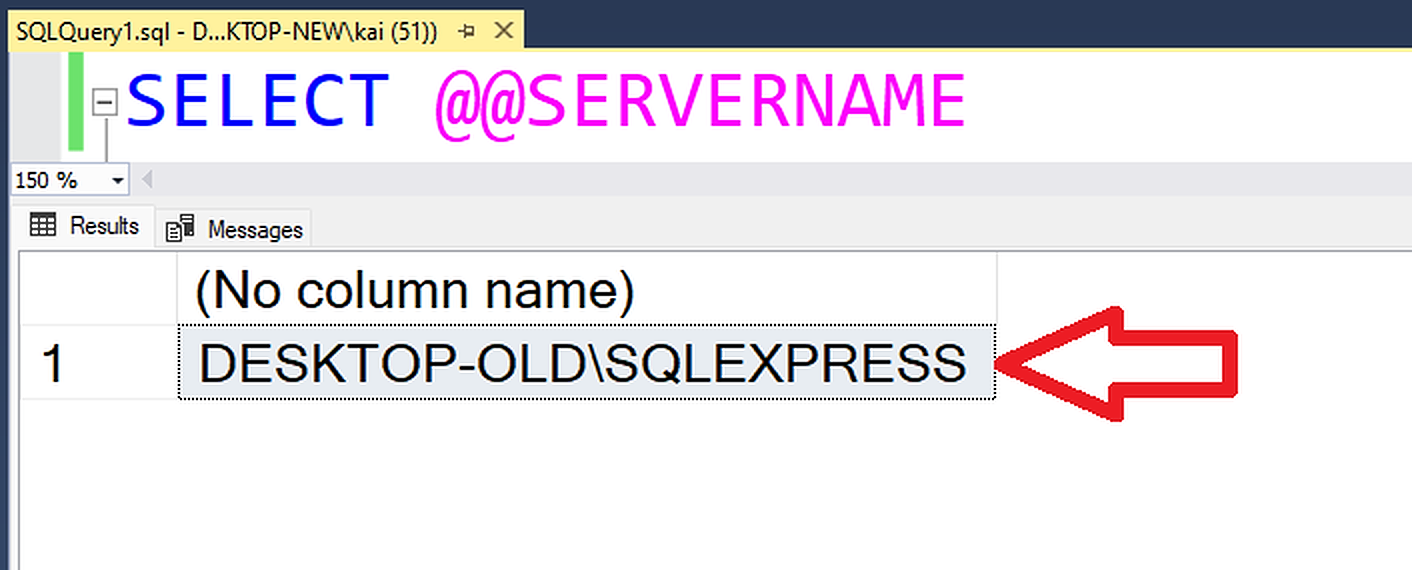 接下来,使用下面的 SQL查询,您可以删除旧的MSSQL服务器“桌面-旧\SQLEXPRESS”,并添加新的MSSQL服务器“桌面-新的\SQLEXPRESS”