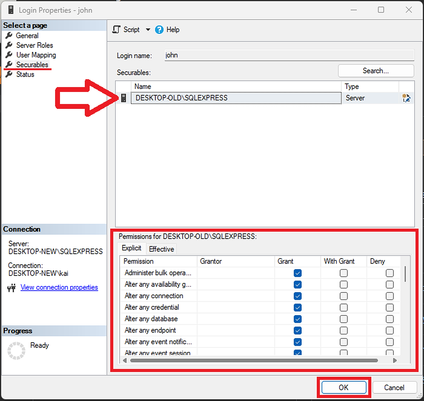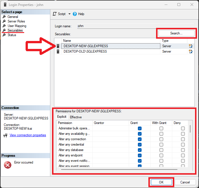 然后,我错误地选中了" grant " for --我的旧服务器“桌面-- old \SQLEXPRESS”来授予它的权限,然后单击了"OK"