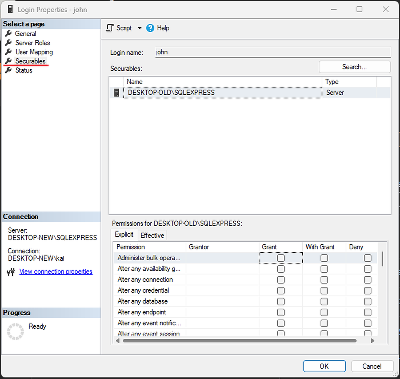 现在,您可以看到"Securables:"中添加了新的MSSQL服务器“桌面-新\SQLEXPRESS”,并且从"Securables:"中删除了旧的MSSQL服务器“桌面-旧\SQLEXPRESS”,如下所示:
