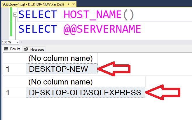 现在,您可以分别检查您的Windows设备名称“桌面-新”和您的MSSQL服务器名称“桌面-旧\SQLEXPRESS”,如下所示: