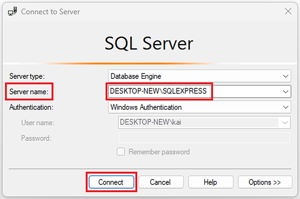 之后,我用新服务器名为“桌面-新\SQLEXPRESS”的连接到。*我使用MSSQL版本