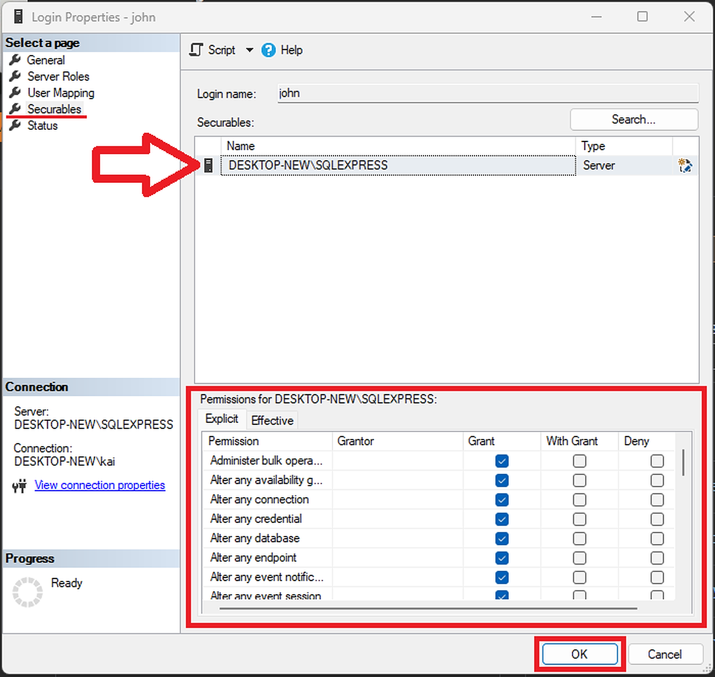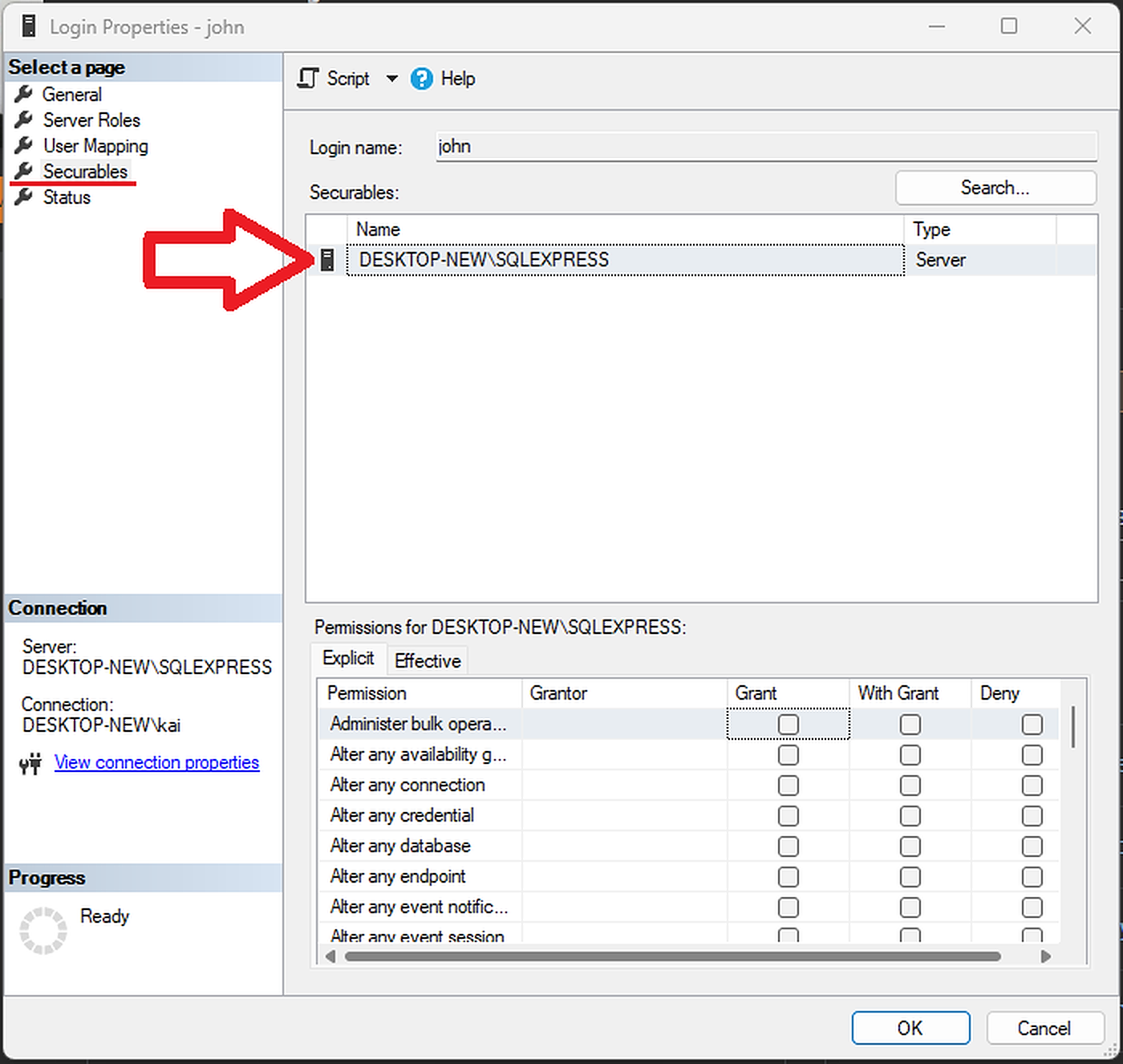 因此,在"Search...",中,我将新服务器“桌面-新\SQLEXPRESS”添加到"Securables:"以授予其权限,然后单击"OK"