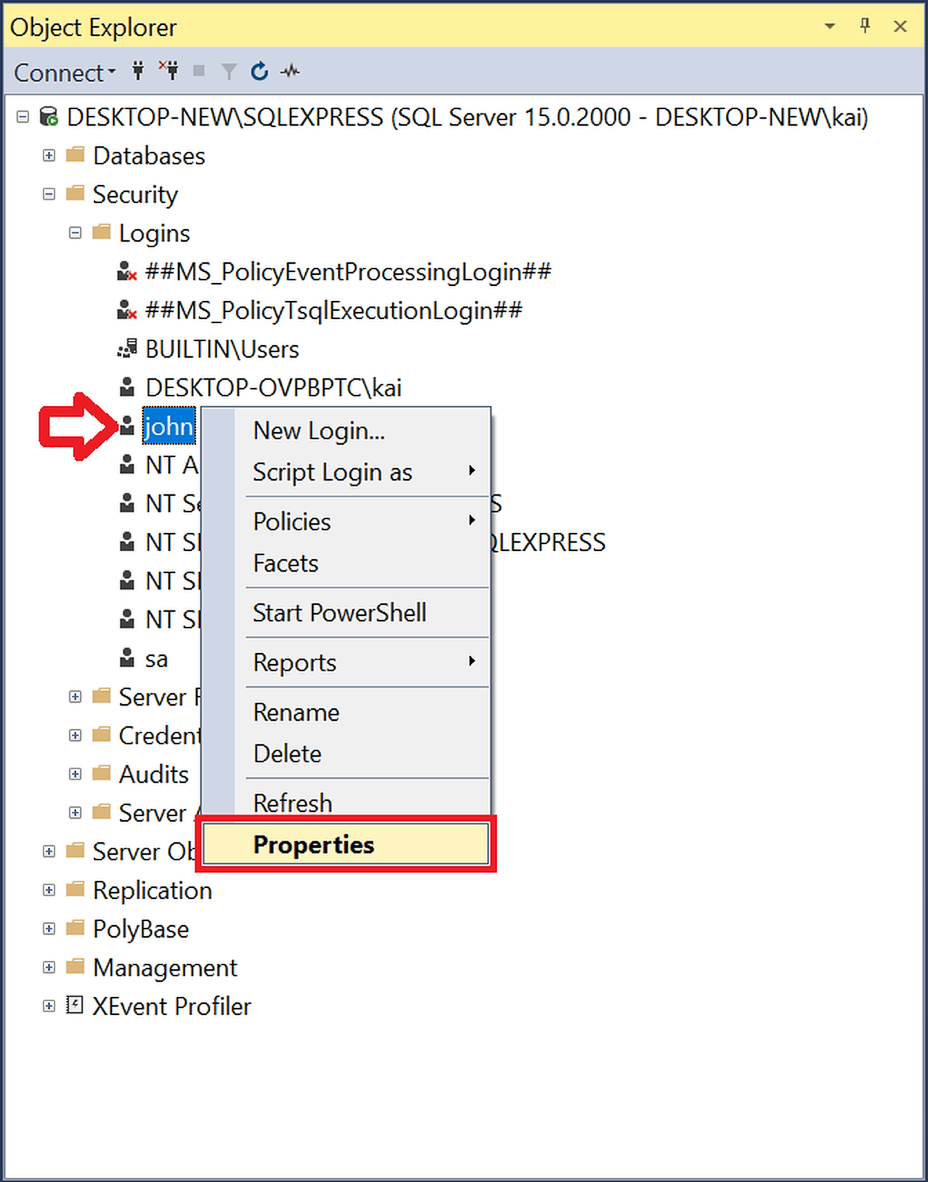 然后,我从"Properties"上点击了"Security/Logins"下的用户"john"