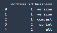 groupby()和first()创建一个business列,该列包含每个groupby() Series.map()遇到的第一个business列,以将原始数据帧的address_id列转换为这个第一个business值