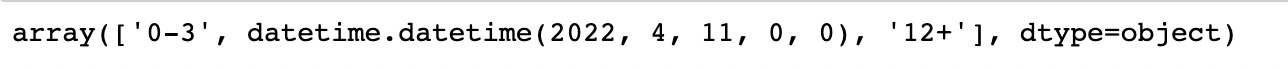 df = pd.DataFrame({'Lifecycle Interval':['0-3',datetime.datetime(2022,4,11,0,0),'12+']})