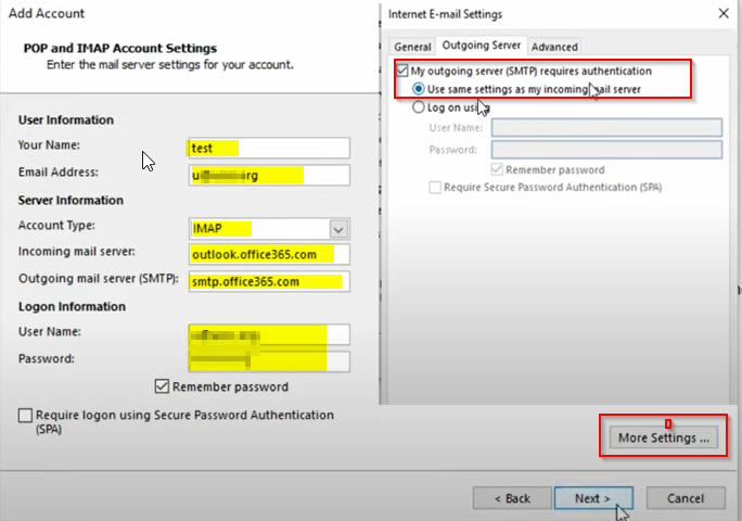 选择POP或IMAP -> next ->make更改用户信息、服务器信息和登录信息,如下面的snip,然后单击“更多设置”。