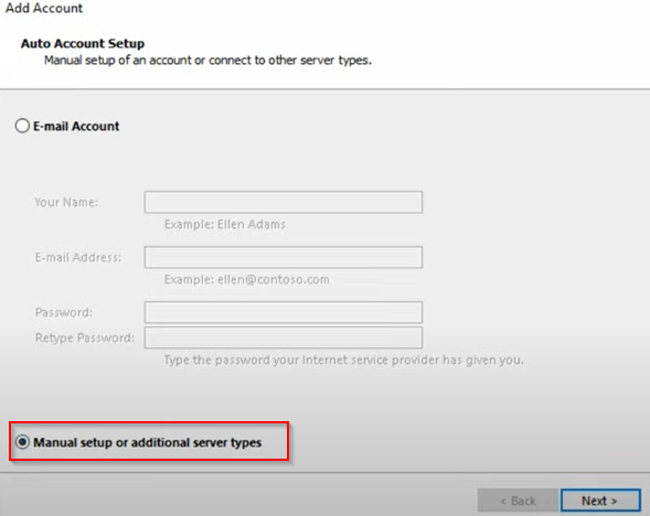 要解决此错误,转到outlook ->,单击手动设置或其他服务器类型按钮,如下面的