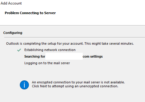 与邮件服务器的加密连接不可用。单击“下一步”尝试使用加密连接。