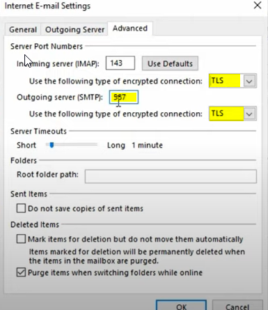在internet电子邮件设置下的传出服务器选项卡下,请检查我的传出服务器选项和高级选项卡,请选择-> TLS或SSL,而不是无,而SMTP应该是587 -> ok ->下一步测试帐户设置->关闭,并完成您的信息将设置到帐户如下。