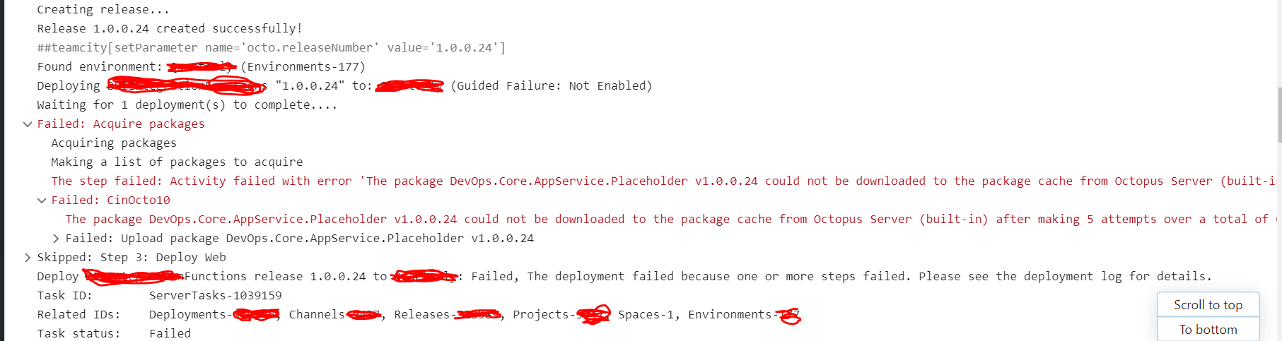 步骤失败:活动失败,错误‘包DevOps.Core.AppService.Placeholder v1.0.0.24无法下载到包缓存从八达通服务器(内置)后,进行了5次尝试在总共0。确保包被推送到提要,并再次尝试部署。有关详细的故障排除指南转到http://g.octopushq.com/TroubleshootMissingPackages'。