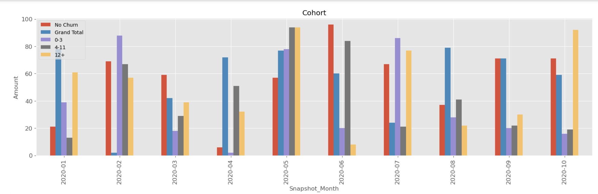 df_rand = pd.DataFrame(np.random.randint(0,100,size=(10, 5)), columns=['No Churn', 'Grand Total', '0-3', '4-11', '12+'])