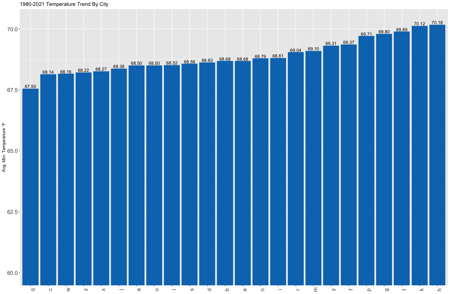 ggplot(aes(x = reorder(CITYNAME,AvgTMin), y = AvgTMin, fill = CITYNAME)) +