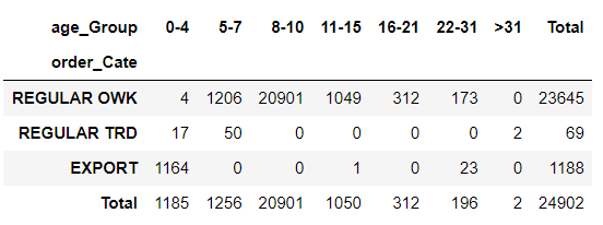df_pivot_qty =df_plain_R.pivot_table(values="line_num",index=["order_Cate"],columns="age_Group",aggfunc = "count",fill_value = 0,dropna = False ,margins=True,margins_name="Total").sort_values(['0-4','5-7','8-10','11-15','16-21','22-31','>31',"Total"])[['0-4','5-7','8-10','11-15','16-21','22-31','>31','Total']]