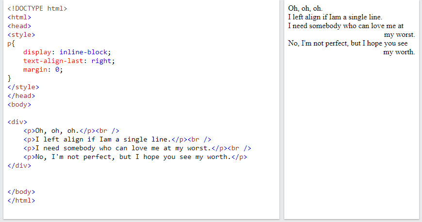 </div>接下来,我们为p添加样式text-align-last: right,并设置display: inline-block使其左对齐,从而避免了前面提到的重写第一行的问题。其结果将是: