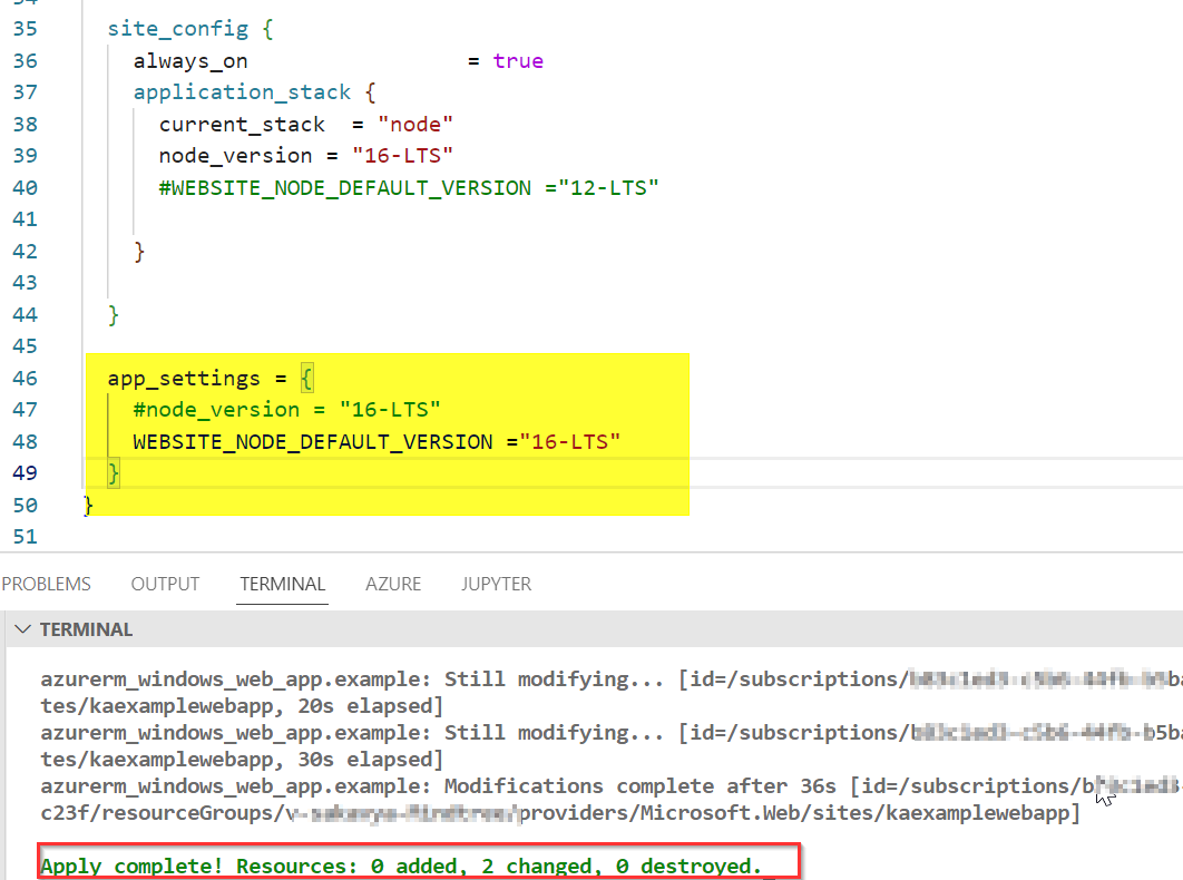 azurerm_windows_web_app“,在linux情况下使用azurerm_linux_web_app。application_stack是site_config块支持的参数之一,其中application_stack有一个current_stack选项,我们可以在其中设置runtime version或应用程序堆栈设置。application_stack、…,cors http2_enabled,ip_restriction,remote_debugging_version等application_stack我在我的环境中尝试过,application_stack有current_stack,这是Windows的应用程序堆栈。可能的值是dotnet、dotnetcore、node、python、php和java。