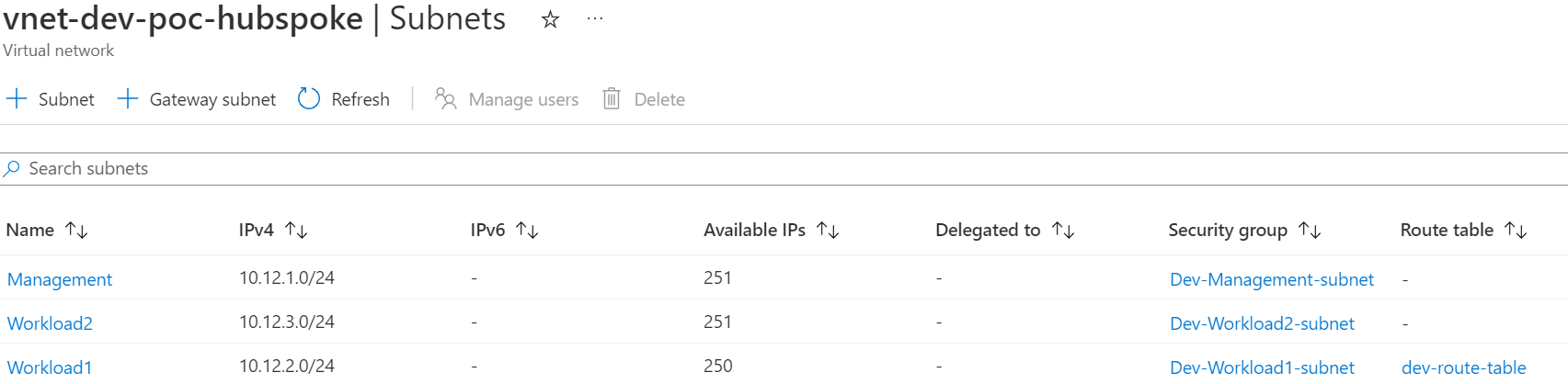 az network vnet subnet create -g $rgName --vnet-name $devVnetName --name Workload1 --address-prefix 10.12.2.0/24