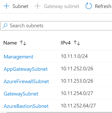 az network vnet subnet create -g $rgName --vnet-name $hubVNetName --name AppGatewaySubnet --address-prefix 10.11.252.0/26
