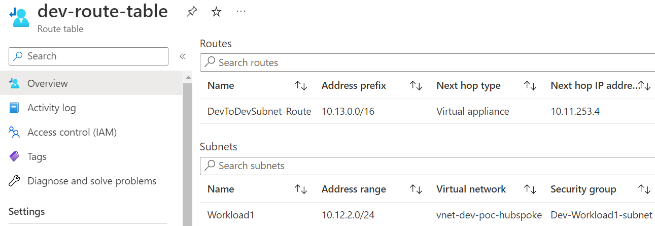 az network vnet subnet update -g $rgName --vnet-name $devVnetName -n Workload1 --address-prefixes 10.12.2.0/24 --route-table $fwRouteTableDevName