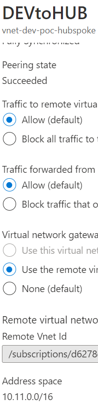 az network vnet peering create -g $rgName --name DEVtoHUB --vnet-name $devVnetName --remote-vnet $hubVNetName --allow-vnet-access --allow-forwarded-traffic --allow-gateway-transit