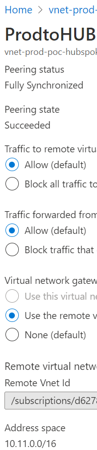 az network vnet peering create -g $rgName --name ProdtoHUB --vnet-name $prodVnetName --remote-vnet $hubVNetName --allow-vnet-access --allow-forwarded-traffic --allow-gateway-transit