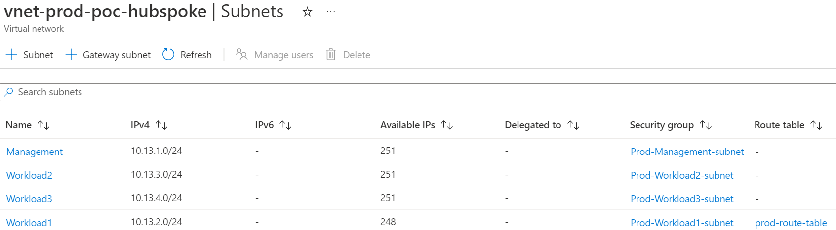 az network vnet subnet create -g $rgName --vnet-name $prodVnetName --name Workload1 --address-prefix 10.13.2.0/24