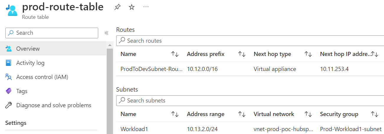 az network vnet subnet update -g $rgName --vnet-name $prodVnetName -n Workload1 --address-prefixes 10.13.2.0/24 --route-table $fwRouteTableProdName