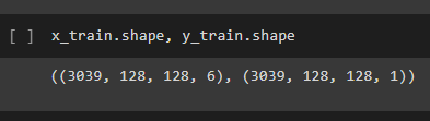 其中3039表示训练样本的数目。因此,我必须将(2583,1900),(2411,2571),(2583,1900),(2583,1900,3)转换为一个尺寸为1,128,128,6的单一数组。