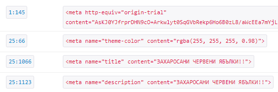 <meta name="title" content="ЗАХАРОСАН�? ЧЕРВЕН�? ЯБЪЛК�?!!">如果您使用的是UTF-8而不是Windows1251,则如下所示: