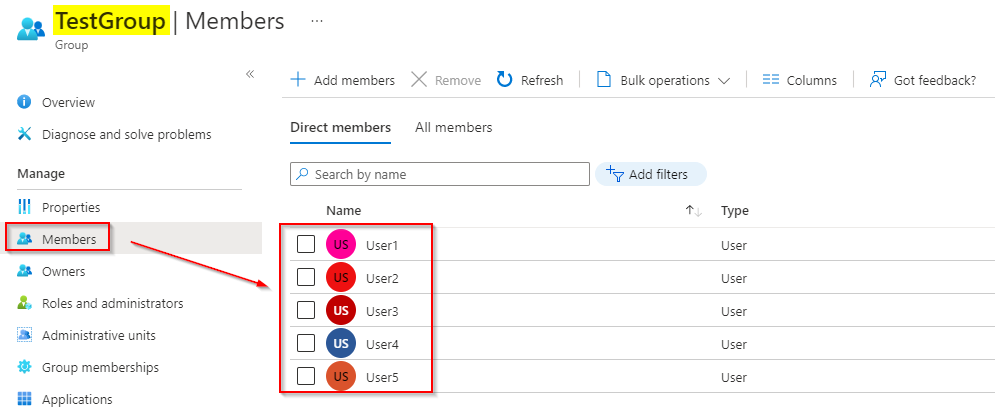 我删除了这5个用户,它们会自动从组中删除,如下所示: