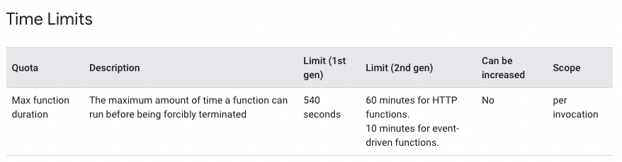 我正在检查https://firebase.google.com/docs/functions/quotas上Firebase函数的配额和限制,我看到2 2gen函数的超时时间长达60分钟。