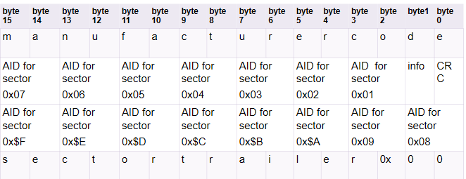 这些信息可能对你有帮助。扇区0是所谓的MAD (Mifare应用程序目录),它表示应用程序的存储位置。在扇区0中,第一个块(0-15 Bytes)是Manufactor-Code,后面是字节16,它是MAD的CRC,然后是Information-Byte,它被阻塞以便进一步开发。然后应用程序Ids (AIDs)开始,其中2字节代表一个应用程序和扇区来查找应用程序。根据这个逻辑,您的数据存储在扇区1中,这在图片中是不常见的。