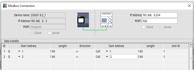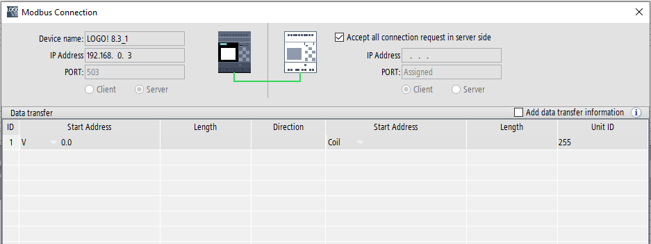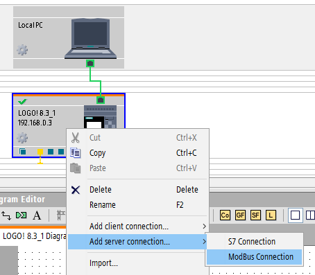 通过PC连接到Logo有两种方法,一种是Logo充当Modbus服务器,另一种是Modbus客户端。
