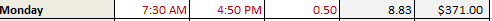 ( 4:50pm - 7:30am )是9.3333333重复,或“9-1/3”。除以24,你会重复8.8333333次,而不是8.83。Excel正在做它应该做的事情,而371.00是正确的数量。如果用例要求将时间四舍五入到.01小时,而不需要进一步舍入,那么您将需要在单元格E8中的某个地方应用四舍五入。