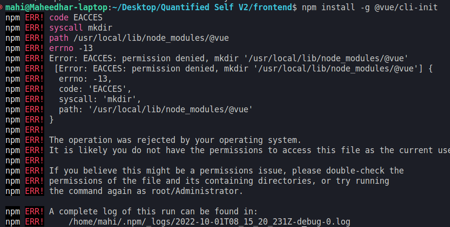 我在前端创建了一个使用vue.js的项目,在后端使用了烧瓶,它运行得很好。但是,在我自定义了我的ubuntu操作系统之后,突然间我无法运行这个项目,我的烧瓶和所有其他框架和库都被卸载了,我无法重新安装vue,当我再次尝试安装vue时,我得到了以下错误消息: