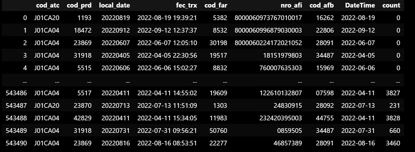 这就是我得到的结果,问题是,如果我再次尝试按DateTime排序我的DF,它会工作,但是"count“列没有任何意义!"Count“列应该是对"COD_Atc”中的每个行名进行计数和计算值,但要遵循日期时间!
