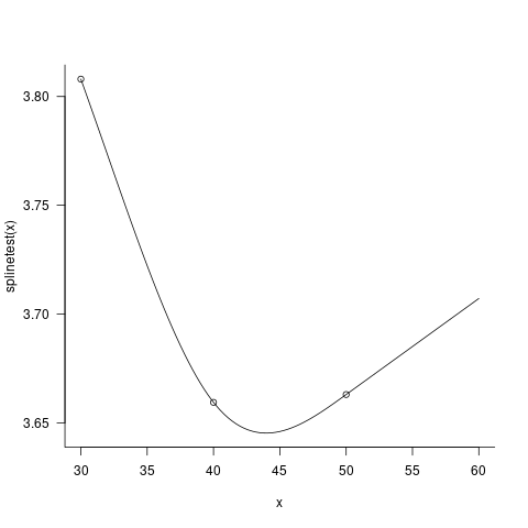正如注释中指出的,用curve(splinetest, from = 30, to = 60); points(x,y)绘制曲线/数据集的末尾清楚地说明了边界导数(x=50)与基于最后两个数据点(即(y(x=50) - y(x=40))/10)的直线之间的区别。