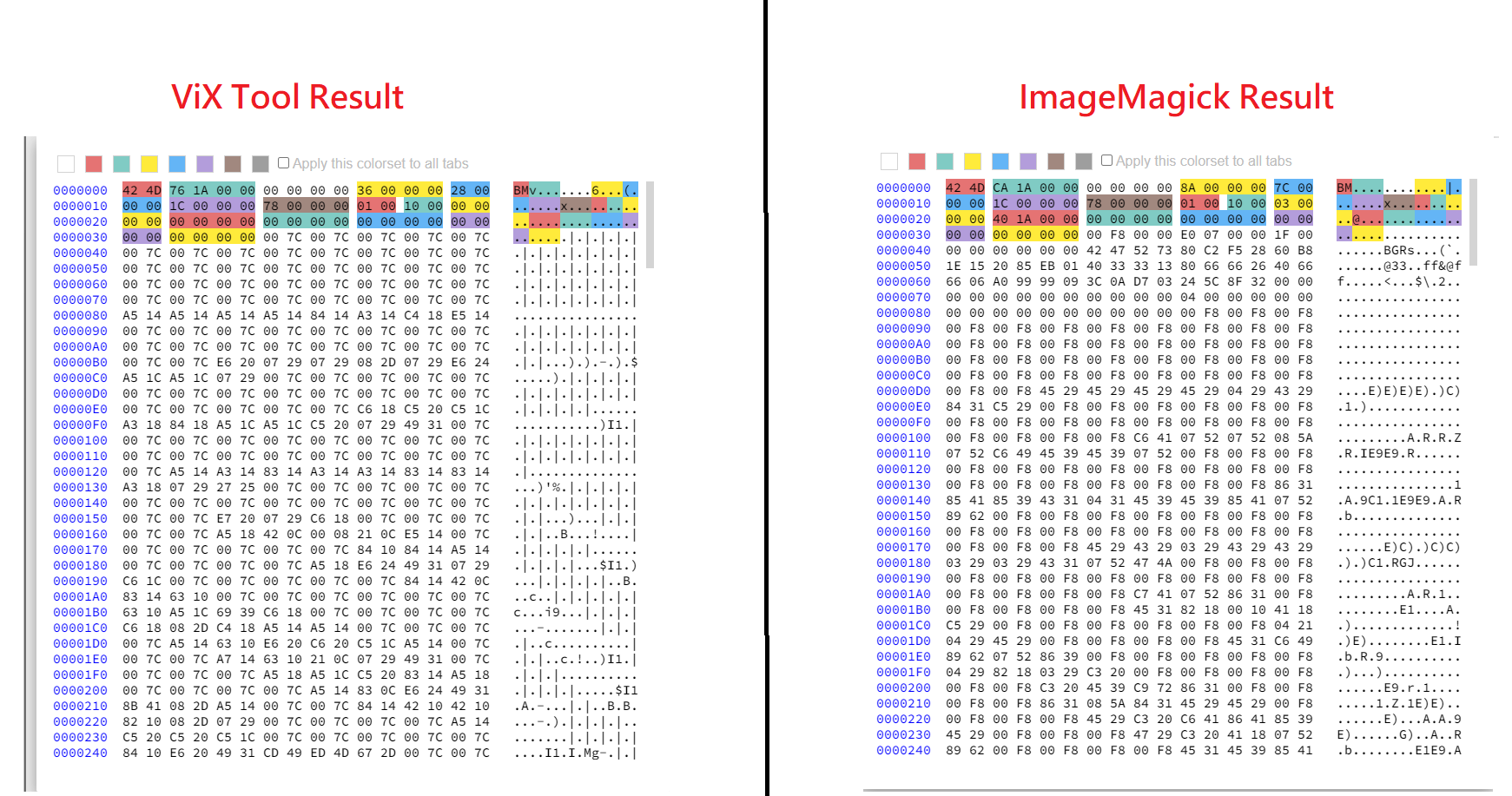 试图通过ImageMagick和ViX統合画像ビュアー将bmp文件从24位转换为16位bmp .这与我的图片中的缩略图一样,但在十六进制内容不是我所期望的。我问的问题,因为我必须将这些16位bmp文件隐藏到.spr (雪碧图像文件)的MMORPG游戏(血统1)。