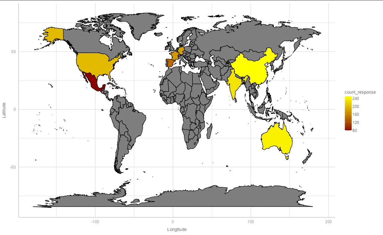 您需要将数据加入到世界地图数据框架中。,这将允许您将填充颜色映射到count_response。