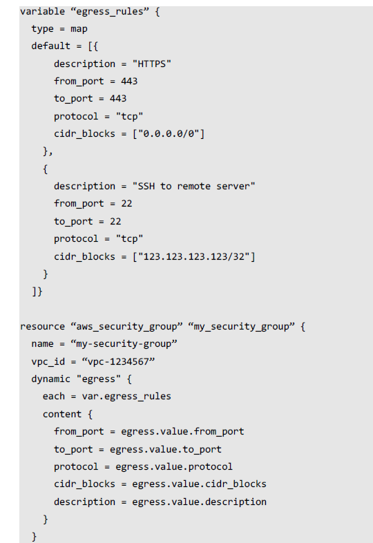 在变量egress_rules中,default下有[{,而以]}结尾。如果您将[{移动到{[,它应该可以工作。