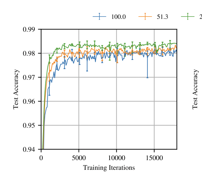 图显示了五次运行的平均精度,垂直值显示了最小和最大精度。